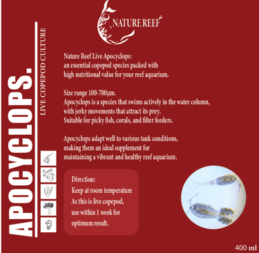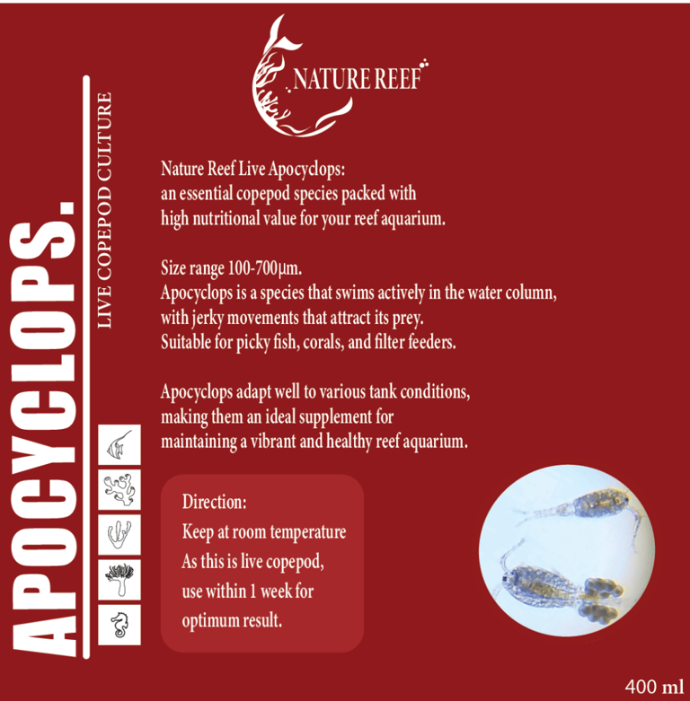 A versatile cyclopoid copepod that inhabits both the water column and substrate. Apocyclops are excellent for nutrient recycling, consuming detritus and algae, and serve as a nutritious live feed for a variety of reef fish and invertebrates.
