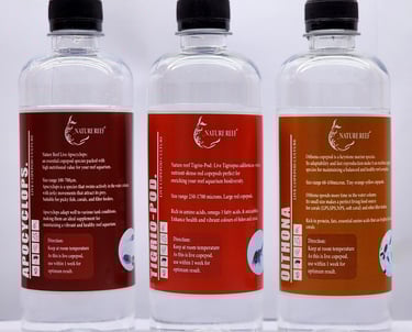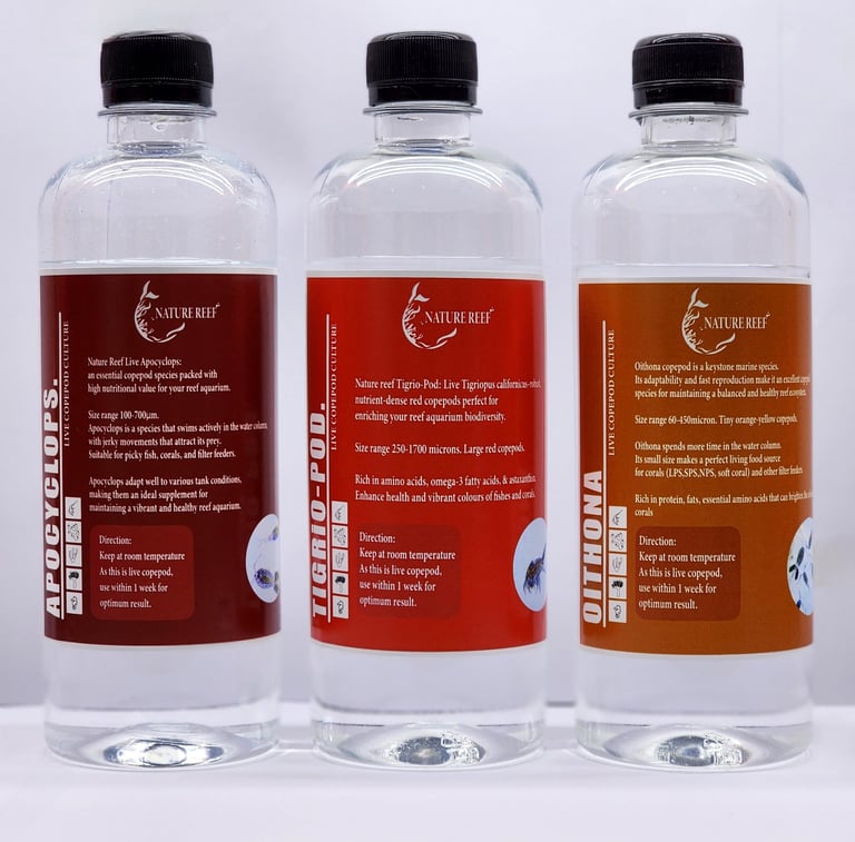 Oithona: The smallest copepod (60-450µm), commonly found in marine environments, and ideal for corals and filter feeders. It is anti-phototactic, meaning it naturally avoids light and reproduces in shaded areas.